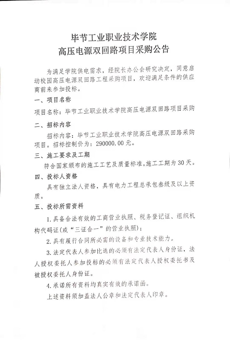 畢節(jié)工業(yè)職業(yè)技術(shù)學(xué)院高壓電源雙回路項目采購公告