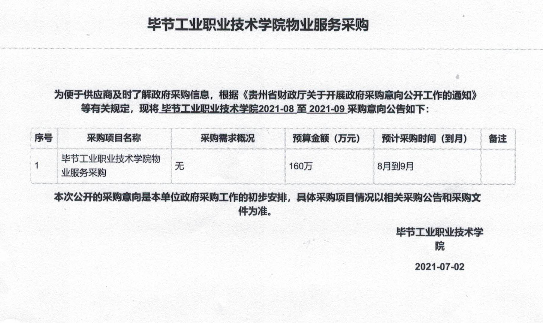 畢節(jié)工業(yè)職業(yè)技術(shù)學(xué)院物業(yè)服務(wù)采購公告