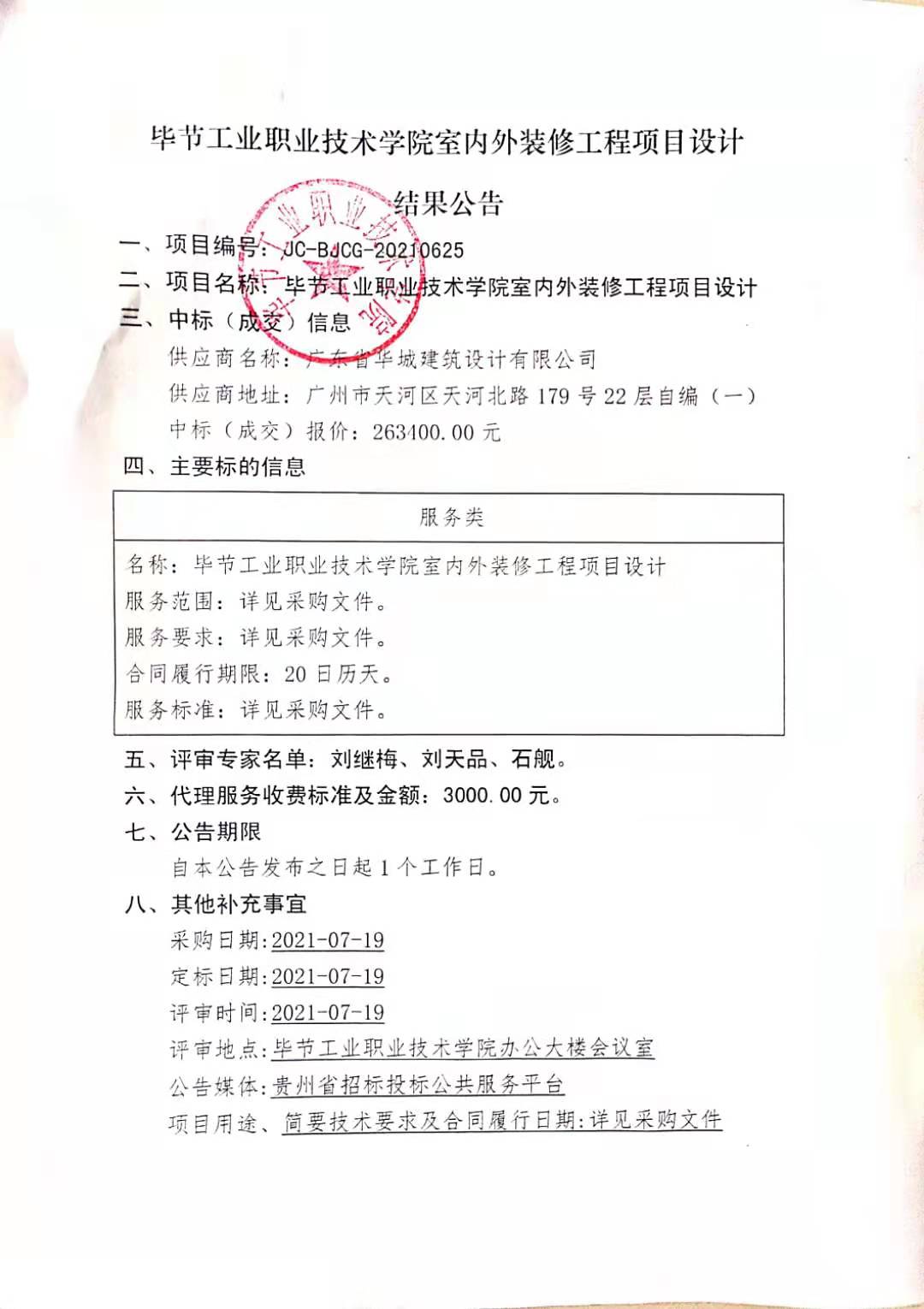畢節(jié)工業(yè)職業(yè)技術(shù)學(xué)院室內(nèi)外裝修工程項(xiàng)目設(shè)計(jì)結(jié)果公告