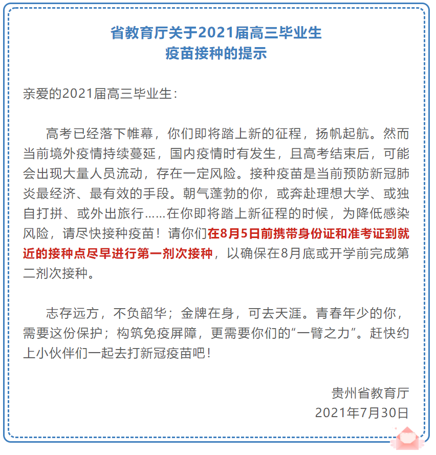 省教育廳向全省2021屆高中畢業(yè)生發(fā)出就近接種疫苗的提示,各地各校要進行轉(zhuǎn)發(fā),多渠道宣傳,讓每一位2021屆高三學生都知曉,力爭在邁進大學校門前在省內(nèi)完成兩針劑疫苗接種。