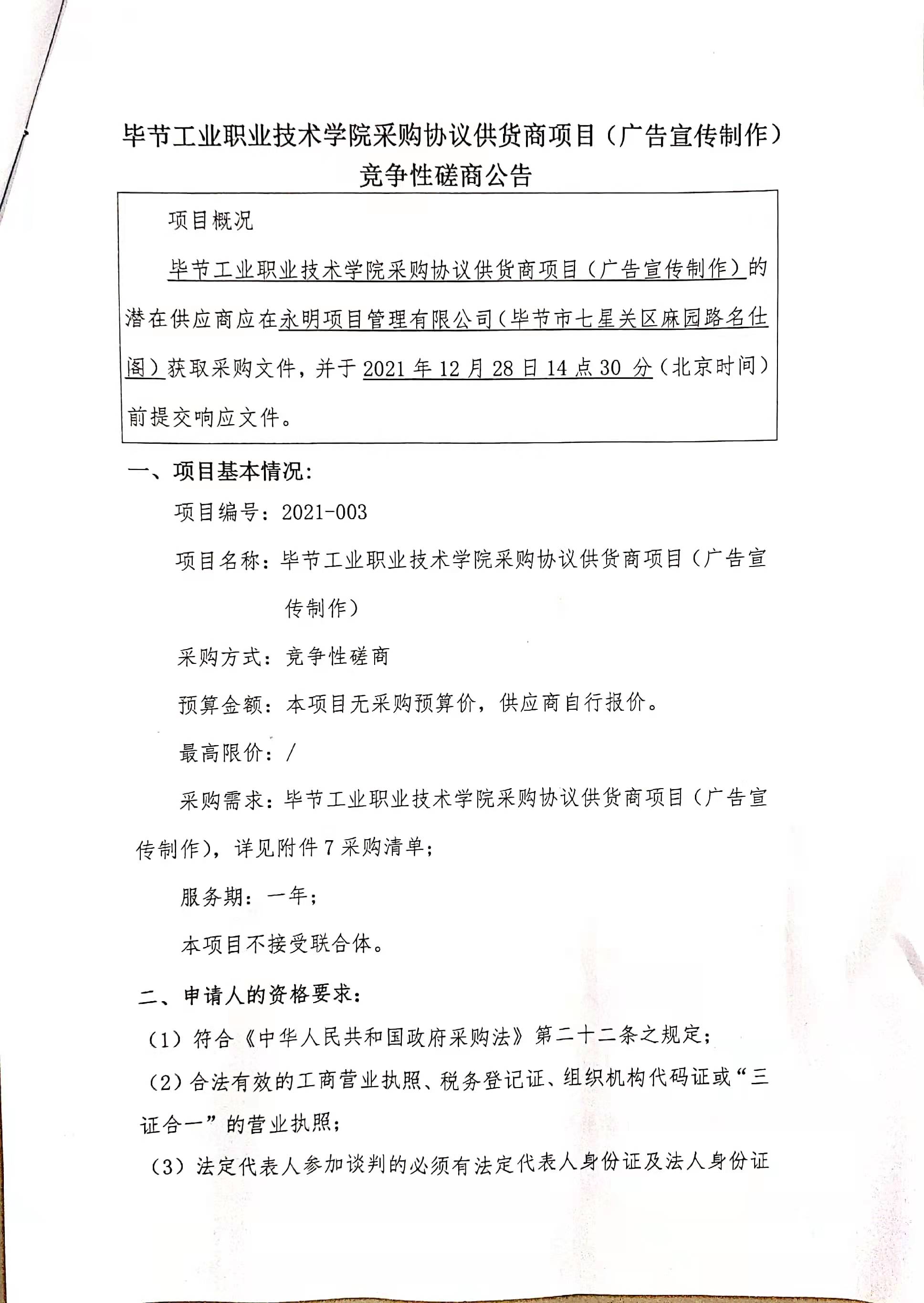 畢節(jié)工業(yè)職業(yè)技術(shù)學(xué)院采購協(xié)議供貨商項(xiàng)目(廣告宣傳制作) 競爭性磋商公告