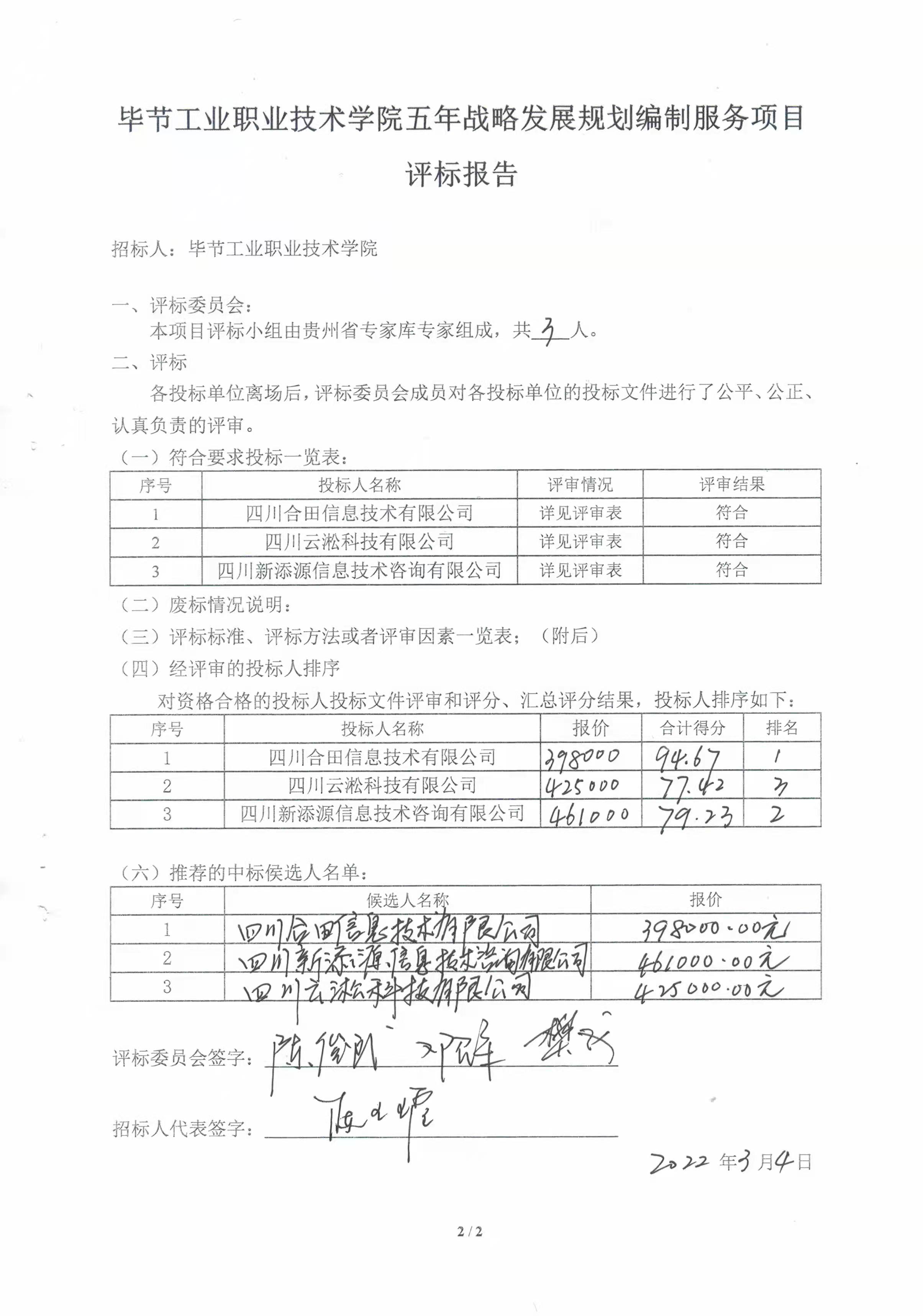 畢節(jié)工業(yè)職業(yè)技術學院五年戰(zhàn)略發(fā)展規(guī)劃編制服務項目評標報告