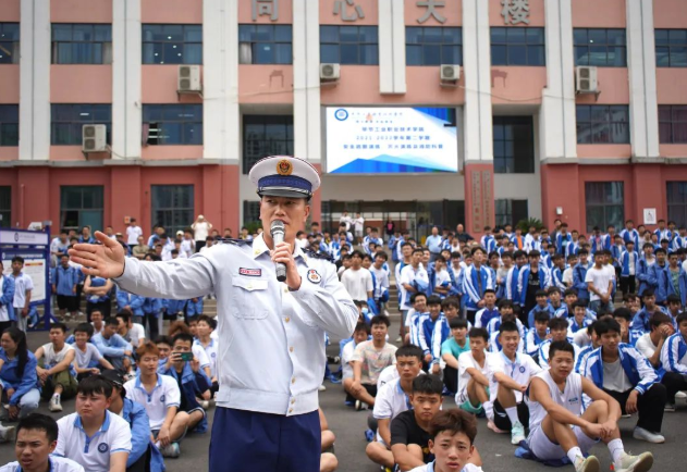 演練中,學(xué)生代表還實(shí)地體驗(yàn)了使用消防救生梯逃生的應(yīng)急處置流程,直觀地體驗(yàn)面對危險(xiǎn)時的正確自救方法以及冷靜有序的撤離。 演練結(jié)束后,消防員給學(xué)生普及了消防知識,金海湖消防大隊(duì)隊(duì)長朱海以真實(shí)案例將消防安全知識深入淺出地進(jìn)行講解,介紹了校園常見火災(zāi)發(fā)生的原因及防范措施,講解了使用滅火器撲救初期火災(zāi)方法。 朱海在總結(jié)演練過程時指出,整個演練安全、高效、有序,達(dá)到了預(yù)期目標(biāo),取得了明顯的成效,檢驗(yàn)了學(xué)院的消防工作。他要求,全體師生要牢固樹立安全防范意識,熟練掌握防踩踏規(guī)范動作,學(xué)會自我保護(hù)的方法,確保在發(fā)生突發(fā)情況時應(yīng)急工作能快速、高效、有序地進(jìn)行,從而最大限度地保護(hù)全體師生的生命安全,減少不必要的傷害。 學(xué)院黨委委員、副院長黃河結(jié)合校園安全工作實(shí)際情況,提出三點(diǎn)要求:一是要求廣大師生牢固樹立“安全第一、生命至上”的理念,強(qiáng)化安全紅線意識,在思想上繃緊安全這根弦;二是要求廣大師生認(rèn)真對待,珍惜這次全疏散演練、滅火演練及消防科普活動的機(jī)會,掌握在緊急情況下迅速逃生、自救、互救的基本技能,提高應(yīng)對火災(zāi)突發(fā)應(yīng)對能力;三是要求相關(guān)職能部門要堅(jiān)持強(qiáng)化安全防范,堅(jiān)持把校園安全隱患排查整治作為一項(xiàng)重要工作常抓不懈、警鐘長鳴,真正做到防患于未然,有效預(yù)防和堅(jiān)決遏制安全事故的發(fā)生。