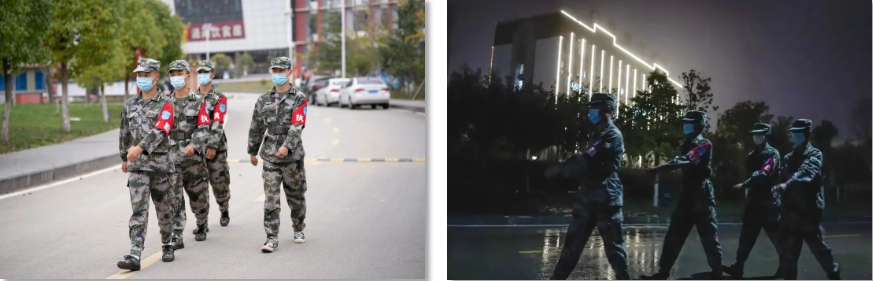 在學(xué)院實施靜默管理至今,校園內(nèi)總能見到一個個身穿迷彩服,英姿颯爽的身影,他們同一線抗疫人員站在一起,默默進(jìn)行著日常巡邏、定點值守、秩序維護(hù)、隱患排查等工作,成為了織密織牢學(xué)院疫情防控網(wǎng)的重要一環(huán)。