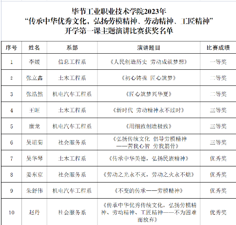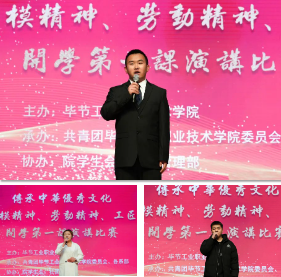 3月28日,畢節(jié)工業(yè)職業(yè)技術(shù)學(xué)院在會議中心舉辦“傳承中華優(yōu)秀傳統(tǒng)文化,弘揚(yáng)勞模精神、勞動精神、工匠精神開學(xué)第一課”主題演講比賽?;顒又荚趯W(xué)習(xí)貫徹黨的二十大精神、習(xí)近平總書記在全國高校思想政治工作會議上的講話精神,傳承中華優(yōu)秀傳統(tǒng)文化,弘揚(yáng)勞模精神、勞動精神、工匠精神,踐行社會主義核心價(jià)值觀。