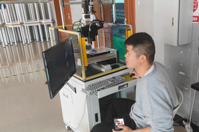 (張朝、田鳳老師指導(dǎo)的學(xué)生陳向東在機(jī)器視覺(jué)系統(tǒng)應(yīng)用項(xiàng)目比賽現(xiàn)場(chǎng))