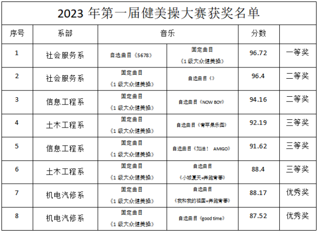 一個(gè)個(gè)優(yōu)美的身影 在田徑場上翩翩起舞 把青春之美展現(xiàn)得淋漓盡致 青春的力量 在陽光下燦爛 悅耳動聽的旋律 輕盈曼妙的舞姿 在賽場上紛紛呈現(xiàn) 在此次健美操大賽中 參賽選手們?yōu)闃s譽(yù)而拼搏 為整個(gè)集體貢獻(xiàn)自己的力量 為自己的青春努力拼搏 精彩的表演結(jié)束后 通過評委的公正打分 共評選出八個(gè)獲獎(jiǎng)參賽隊(duì)伍 祝賀獲獎(jiǎng)隊(duì)伍和指導(dǎo)老師 愿大家一如既往、再接再厲