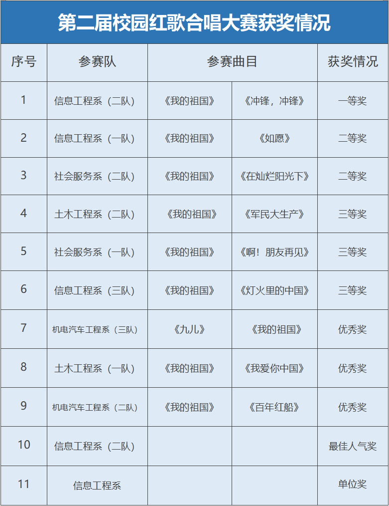 5月31日晚 學(xué)院多功能廳 上演了一場 精彩的紅歌合唱大賽 (信息工程系一隊) (社會服務(wù)系二隊) (土木工程系二隊) (社會服務(wù)系一隊) (信息工程系三隊) (機(jī)電汽車工程系三隊) (土木工程系一隊) (機(jī)電汽車工程系二隊) 雄渾的歌聲 整齊的隊伍 一個個滿腔熱血的學(xué)子 展現(xiàn)著積極昂揚(yáng)的風(fēng)貌 一曲曲波瀾起伏的合唱 唱出了祖國胸懷之豪邁 他們用充滿激情的歌聲 詮釋了工職院學(xué)子 青春的熱血和飽滿的精神 此次大賽的成功舉辦 不僅豐富了同學(xué)們的文化生活 更在整個校園形成了 愛黨愛國的濃厚氛圍 最后 在評委們公正公平的評選下 誕生了此次大賽的各個獎項