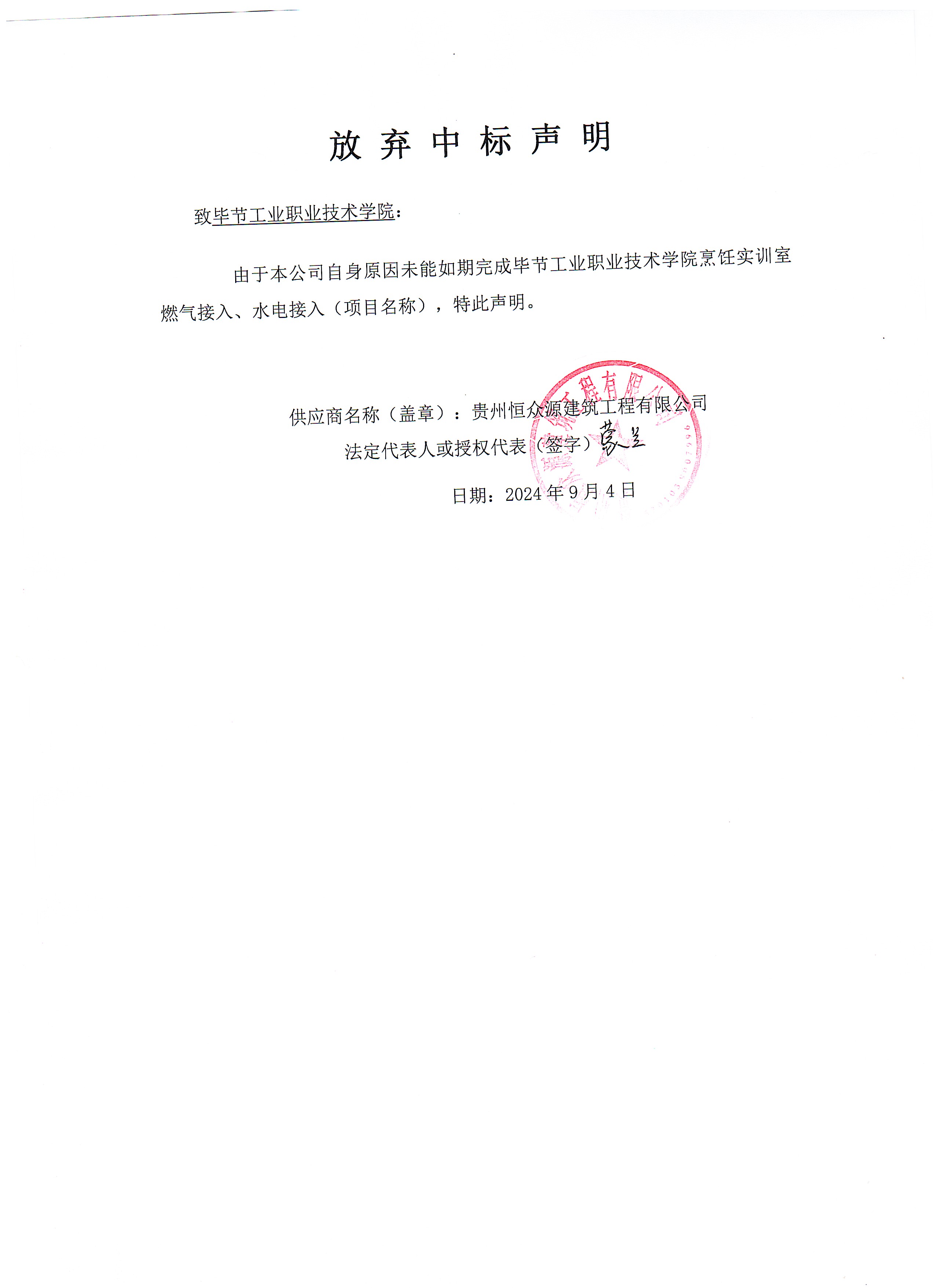 中標(biāo)供應(yīng)商提出放棄中標(biāo)聲明