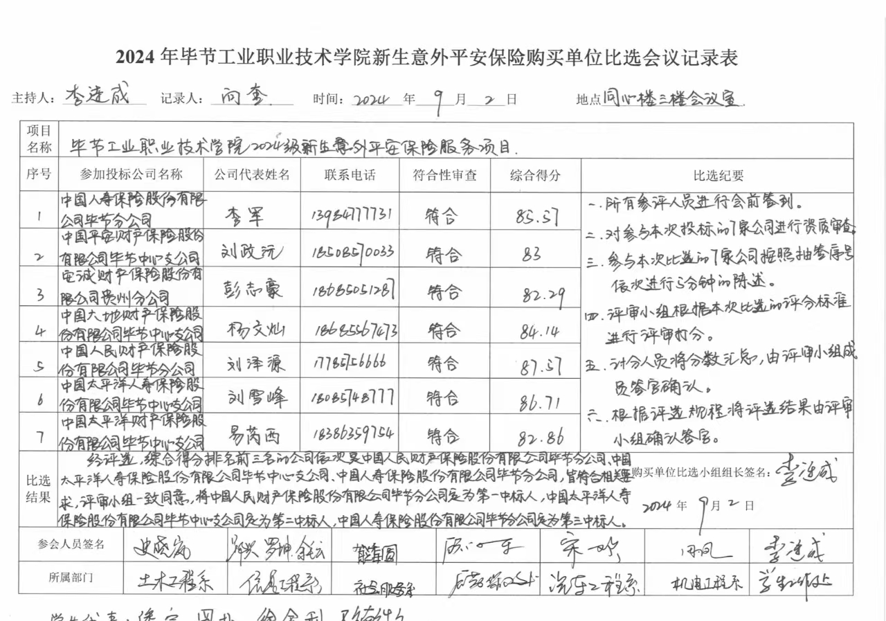 畢節(jié)工業(yè)職業(yè)技術(shù)學(xué)院2024級(jí)新生意外平安保險(xiǎn)服務(wù)項(xiàng)目比選結(jié)果公告