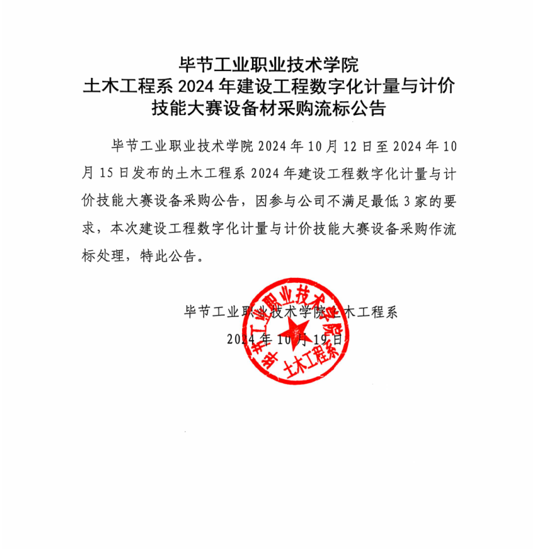 畢節(jié)工業(yè)職業(yè)技術學院土木工程系2024年建設工程數(shù)字化計量與計價技能大賽設備耗材采購流標公告