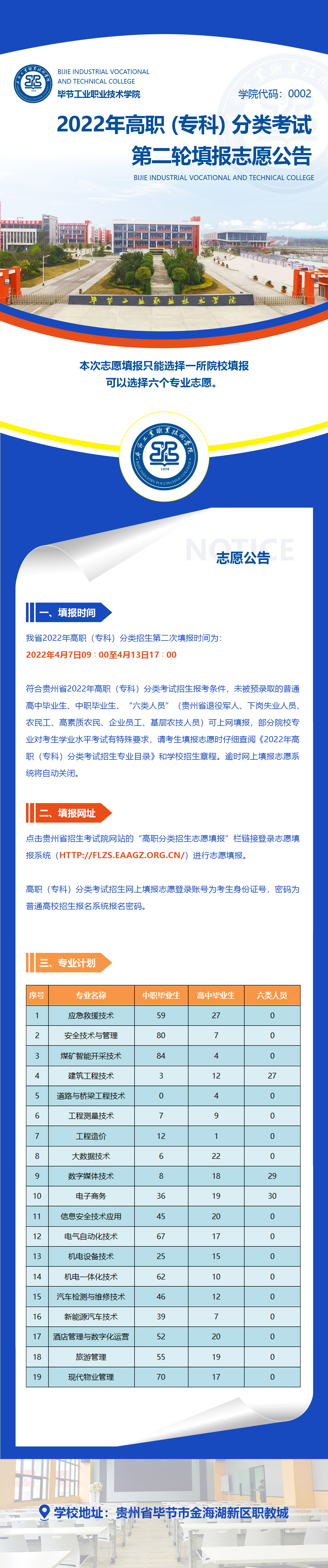 畢節(jié)工業(yè)職業(yè)技術(shù)學(xué)院2022年高職(專科)分類考試第二輪填報(bào)志愿公告